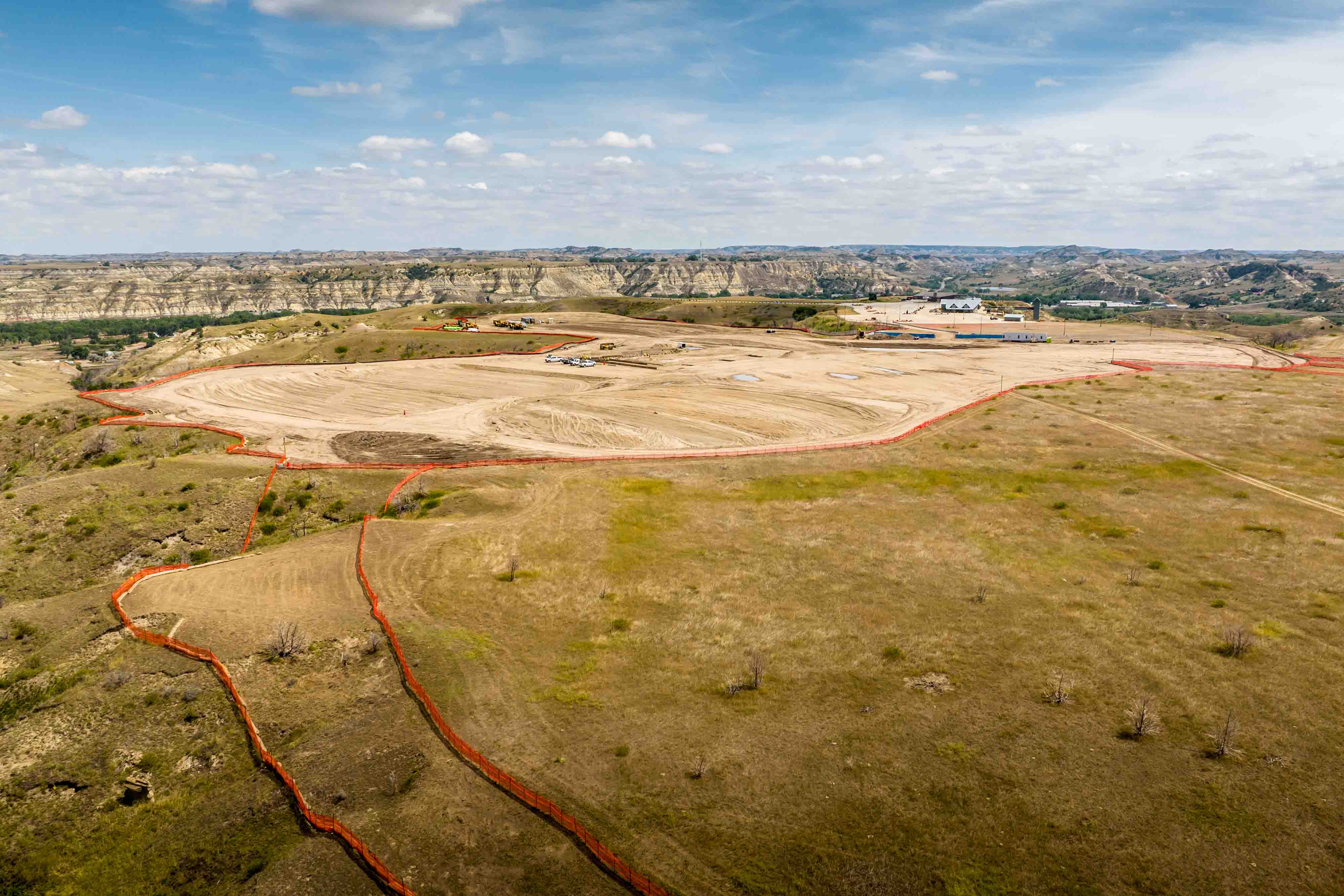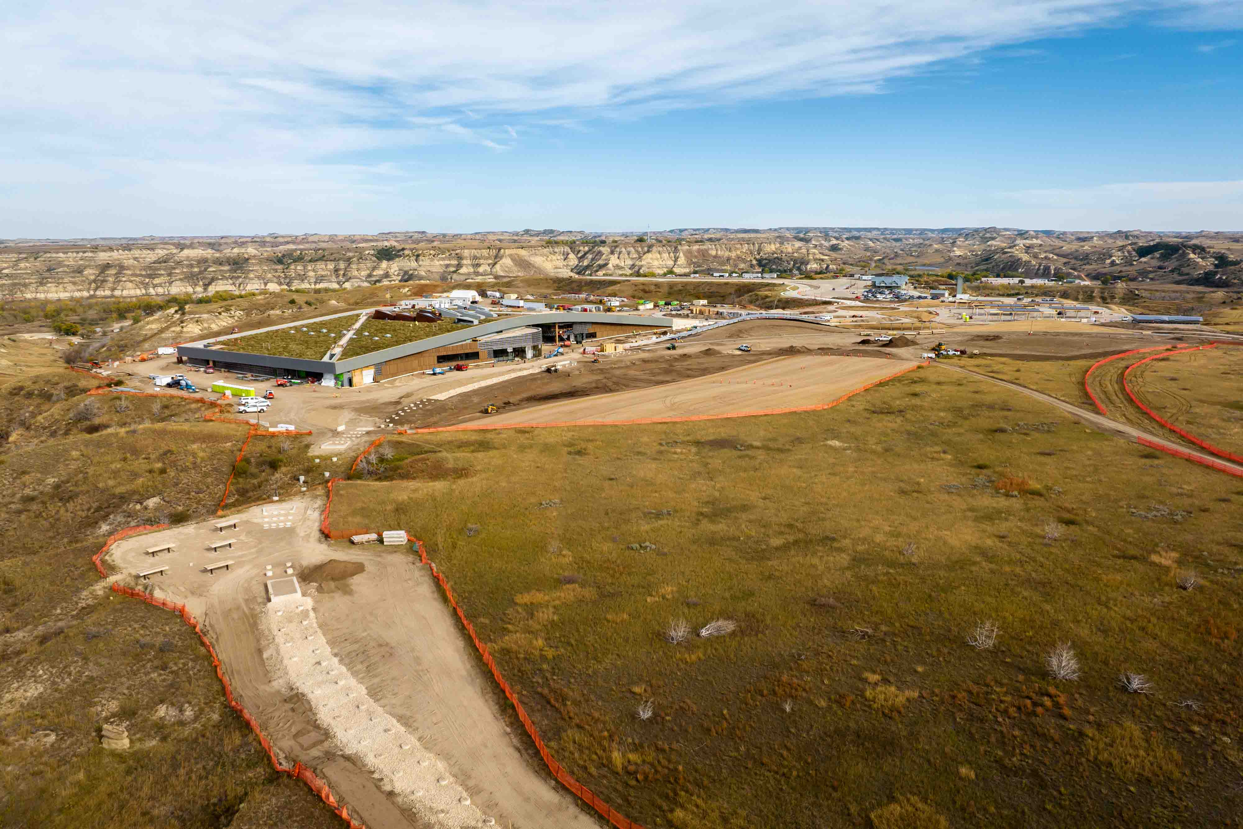 The earthwork also established the building's relationship to the terrain. Snøhetta's design called for one end of the roof to terminate at ground level, allowing prairie grasses to flow over the structure. Achieving that integration required precise grading that Martin's crews executed across the rolling topography.