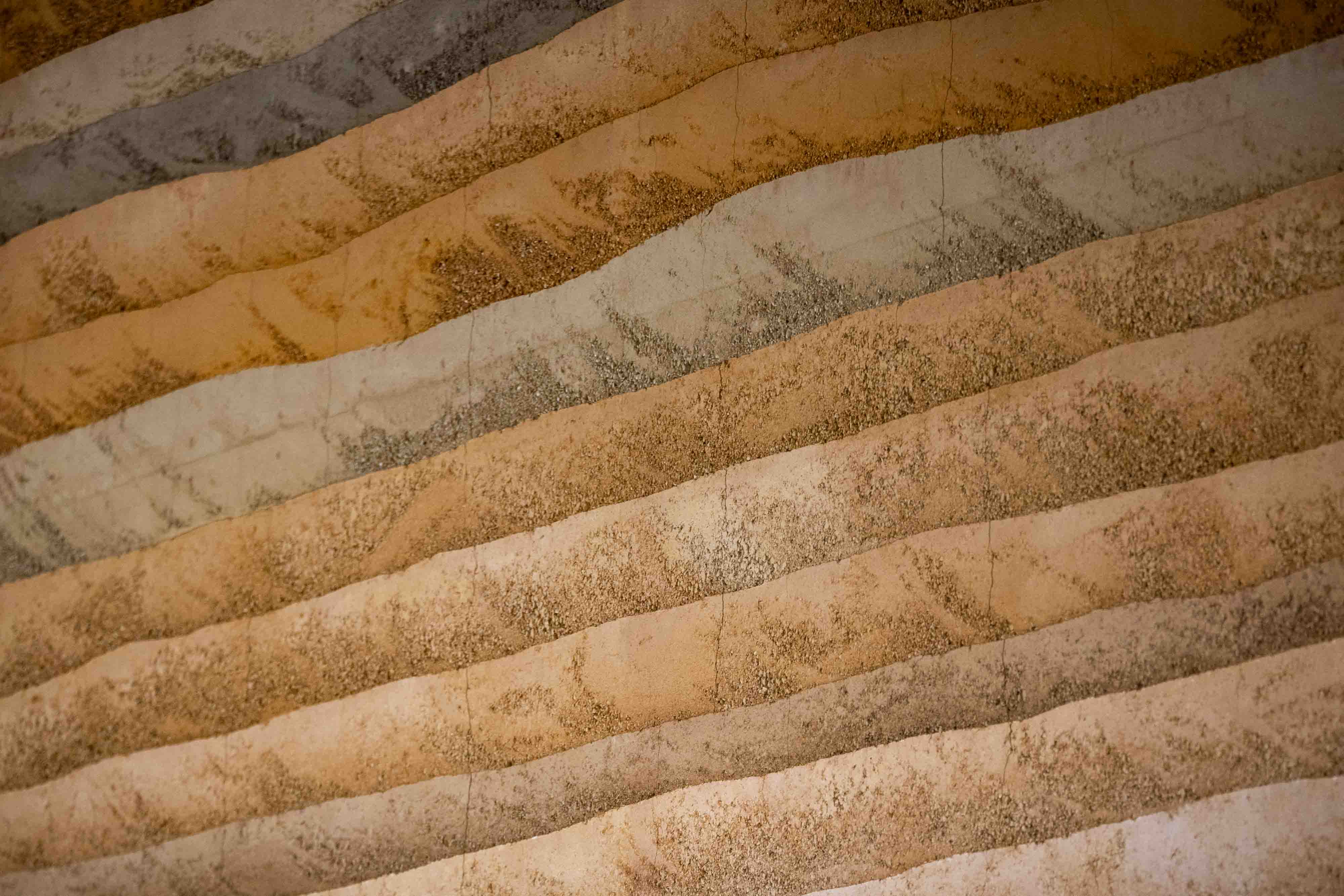 The wall's surface is intentionally rough-hewn - pocked and porous, with uneven layers in an earthy palette of sand, stone, mud, and dust. It's tactile in a way most public buildings avoid.